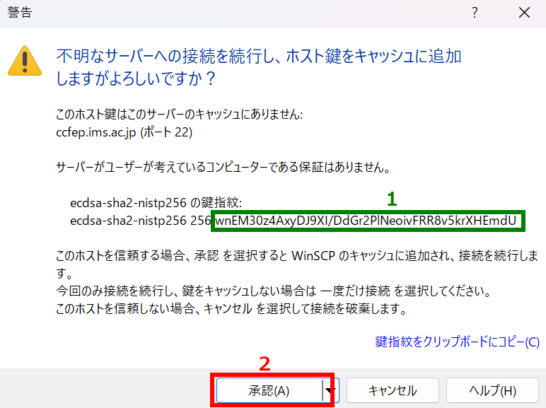 初回接続時には上のような警告が表示されます。表示された fingerprint が以下のどれかに一致するかを確認し、問題無いようでしたら「承認」をクリックして先に進みます。